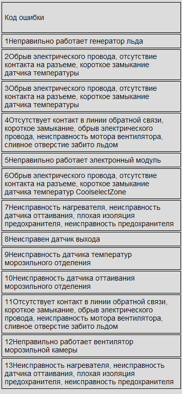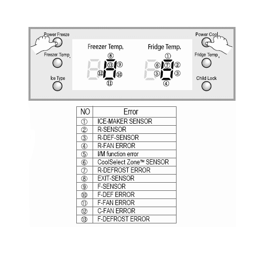 При возникновении ошибок или неполадок в работе холодильника не нужно его выключать, иначе информация об ошибках будет стерта. Чтобы уточнить неисправность, необходимо войти в режим самодиагностики. Для этого одновременно нажмите кнопки Power Freeze и Power Cool и в течение 8 секунд удерживайте их.