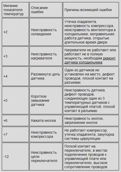 Сигнализирует о неисправности холодильника индикаторная панель температуры холодильной камеры. Если индикатор горит, не мигая, он показывает температуру холодильной камеры. Если же системой управления обнаружена неисправность, индикатор температур начинает мигать. Отключается сигнализация неисправности только при переключении системы управления в режим автоматического тестирования или при устранении неисправности.