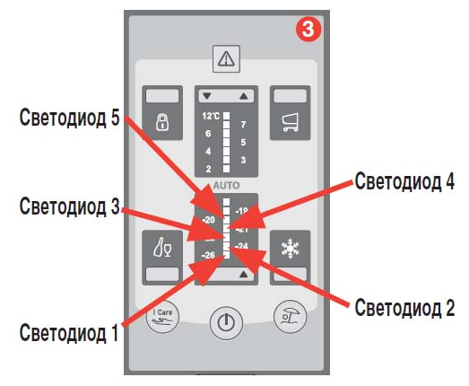 В случае интерфейса Mid cо светодиодными полосками и кнопками (Рис. 3) выполнить индикацию неисправностей с помощью светодиодов на световой полоске морозильника (Таблица неисправностей 2). В случае цифрового интерфейса Digit с семисегментным дисплеем (Рис.5) и сенсорного интерфейса Touch (Рис.4) выполнить индикацию неисправностей с помощью сообщения на дисплее.