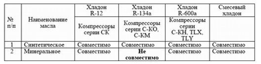 Хладон R-12 и смесевый хладон совместимы как с минеральным, так и с синтетическим маслами.