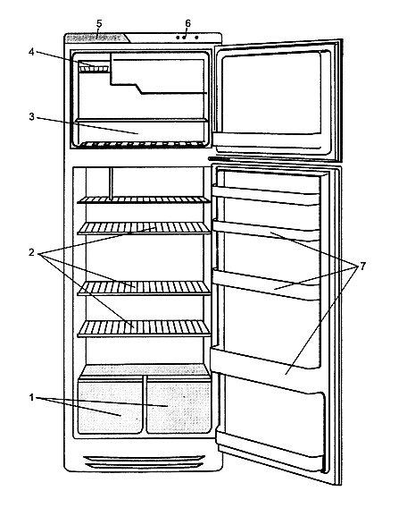 1 — контейнеры для овощей; 2 — полки холодильного отделения; 3 — морозильное отделение; 4 — лоток для льда; 5 — индикаторная панель; 6 — кнопки управления; 7 — дверные полки