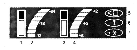 1 — индикатор работы морозильной камеры; 2 — индикаторы заданной и фактической температур морозильной камеры; 3 — индикатор работы холодильной камеры; 4 — индикаторы заданной и фактической температур холодильной камеры; 5 — индикатор открытой двери; 6 — индикатор превышения допустимой температуры; 7 — индикатор режима быстрого замораживания