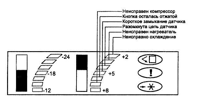 Сигналы неисправности извещают пользователя о необходимости вызвать специалиста по ремонту. Эти сигналы не могут быть отключены пользователем. При возникновении какой-либо неисправности индикаторы холодильной камеры начинают мигать, как показано на рисунке. Перед включением сигнализации неисправности отключаются компрессор, двигатель вентилятора и нагреватели. Заслонка полностью открывается. Сигнализация неисправности отключается только при переходе в режим автоматического тестирования. Индикатор температуры холодильной камеры одновременно служит и индикатором неисправности. Если лампа индикатора горит не мигая, то индикатор указывает температуру холодильной камеры, если же лампа индикатора мигает, это указывает на неисправность.При обнаружении системой управления какой-либо неисправности лампы индикатора начинают мигать и компрессор автоматически выключается (кроме случая подачи сигнала о том, что одна из кнопок осталась нажатой). Индикация неисправности продолжается до тех пор, пока неисправность не будет устранена, а холодильник переведен в режим автоматического тестирования.На рис. 7 указаны поля на индикаторной панели холодильного отделения, свечение которых указывает на неисправность компрессора, предупреждение о том, что кнопка осталась нажатой, короткое замыкание датчика, размыкание цепи датчика, неисправность нагревателя и охлаждения.