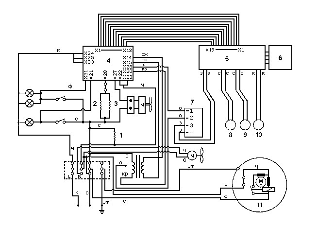1 — нагреватель воздуховода; 2 — нагреватель испарителя; 3 — нагреватель размораживания; 4 — силовая плата; 5 — управляющая плата; 6 — плата кнопок; 7 — заслонка; 8 — датчик морозильного отделения; 9 — датчик холодильного отделения; 10 — датчик размораживания; 11 — компрессор