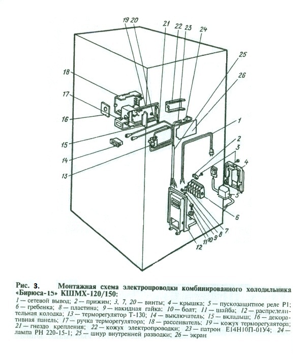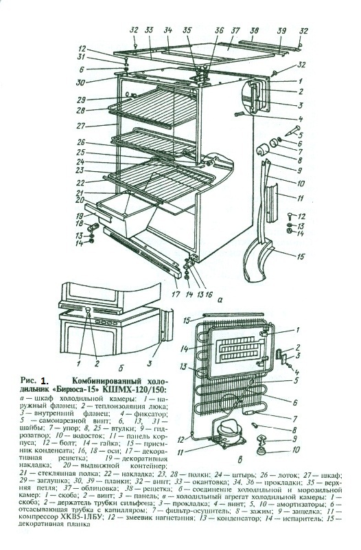 Комбинированный холодильник «Бирюса-15» конструктивно выполнен из отдельных двух шкафов (рис. 1, а, б), включающих холодильную камеру объемом 120 дм3 и морозильную — объемом 150 дм3.Ниже рассмотрен ремонт холодильной камеры и агрегата холодильной камеры.Замена холодильного агрегата. Извлекают из холодильной камеры полки, барьеры и резервуары. С помощью отвертки извлекают два фиксатора 4 (рис. 1, а) крепления испарителя и снимают скобы 1 (рис. 1, в). Ослабляют два винта 4 и отсоединяют трубку сильфона терморегулятора, а также штепсельную колодку пускозащитного реле 5 (см. рис.3) от компрессора 11 (см. рис. 1, в), сняв зажим 8. Отсоединяют компрессор 11 от основания шкафа холодильника, вынув защелку 9. Вывинчивают винты 5 (см. рис. 1, а) и отсоединяют конденсатор 13 (см. рис. 1, в) от задней стенки шкафа. Вывинчивают винты 32 (см. рис. 1, а), снимают наружный фланец1, теплоизоляцию люка 2 и внутренний фланец 3. Выводят испаритель из холодильной камеры через люк шкафа. Новый холодильный агрегат устанавливают в обратной последовательности.Ремонт двери холодильной камеры. Вывинчивают два винта 32 (рис. 1, а), снимают решетку 38 и выдвигают облицовку 37. Ослабляют два болта 12, крепящих верхнюю петлю 35, и снимают дверь. Вывинчивают винты 16 (рис.3), вынимают защелку 15 и снимают панель 2 двери с уплотнителем 18. Устраняют неисправность. Сборку и навеску двери проводят в обратной последовательности. Регулируют положение двери, обеспечив уплотнение дверного проема.Ремонт сервировочной поверхности. Вывинчивают два винта 32 (см. рис. 1, а), снимают решетку 38 и выдвигают облицовку 37. Вынимают прокладку 34, вывинчивают четыре винта 32 крепления окантовки. Устраняют неисправность. Сборку проводят в обратной последовательности.
