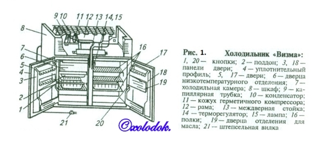 Устройство холодильника. Холодильник выполнен в виде металлического шкафа с внутренней пластмассовой холодильной камерой 7 общим объемом 160 дм (рис.1), закрываемой двумя дверями 5 и 17. Между стенками шкафа и камеры, а также в дверях холодильника помещена теплоизоляция из пенополистирола, препятствующая проникновению в камеру теплоты. Двери в закрытом положении плотно прилегают к шкафу благодаря специальным магнитным вставкам, которые находятся в эластичных уплотнительных профилях 4, закрепленных по периметру внутренних пластмассовых панелей 3 и 18. Магнитные вставки находятся на трех сторонах уплотнения, осевая сторона немагнитная.