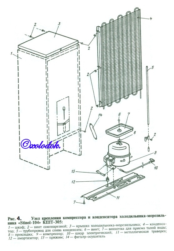 Компрессор 9 (рис.4) холодильного агрегата расположен на металлической траверсе 11 в машинном отделении в задней части шкафа. На задней стенке шкафа закреплен конденсатор 4. Роль дросселирующего устройства играет капиллярная трубка внутренним диаметром 0,71 мм. Наличие такого элемента в схеме агрегата делает его чувствительным к попавшим во внутреннюю систему влаге и другим загрязнениям. В агрегате для очистки и осушки его системы предусмотрен фильтр-осушитель. Однако при значительных количествах влаги и загрязнений, попавших в систему (при утечках фреона на стороне всасывания), установка нового фильтра-осушителя может быть недостаточна.По контуру дверного проема МК у холодильников данной модели проложена специальная трубка, по которой теплый хладагент подается на конденсатор. Трубка обогревает дверной проем, препятствуя конденсации влаги и примерзанию дверей к шкафу. Эта трубка запенена ППУ.