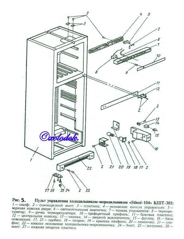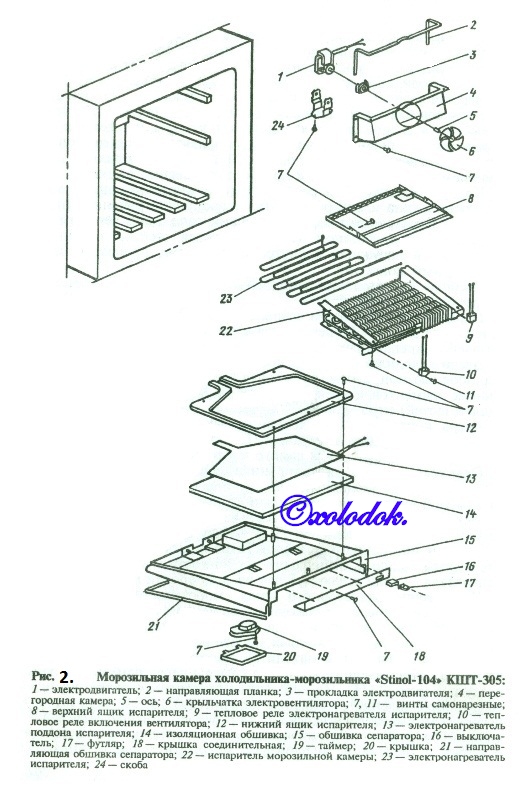 Под холодильной камерой находится выдвижная камера-контейнер для хранения овощей и фруктов, охлаждение которой осуществляется благодаря попаданию в нее холодного воздуха через отверстие в задней части холодильной камеры и эжекции его обратно в холодильную камеру через дефлектор, расположенный в нижней передней части холодильной камеры. Холодильник выполнен в виде прямоугольного теплоизолированного шкафа.Корпус холодильника состоит из наружного металлического панельного типа и внутреннего (из ударопрочного полистирола) шкафов. Пространство между шкафами заполнено теплоизоляцией — пенополиуретаном (ППУ), которая жестко соединяет между собой наружный и внутренний шкафы, превращая их в неразборный моноблок.Дверные панели также заполнены теплоизоляцией — пенополиуретаном.Передний проем шкафа закрывается тремя дверями. Плотное прилегание Дверей обеспечивается с помощью магнитных уплотнителей, закрепленных на внутренней панели дверей.Двери холодильной и морозильной камер представляют собой неразборные моноблоки, раздельная замена отдельных конструктивных элементов дверей (кроме съемных сервировочных принадлежностей) невозможна.Дверь контейнера для хранения овощей и фруктов, также «запененную» пенополиуретаном (ППУ), можно отделить от уплотнительной прокладки и самого контейнера.Охлаждение камер холодильника осуществляется холодильным агрегатом, выполненным по двух испарительной схеме (рис. 1,б.) аналогично холодильнику «Stinol-101».Испаритель холодильной камеры, выполненный из медной трубки, закреплен и запенен ППУ между задними стенками наружного и внутреннего шкафов. Такая конструкция делает его несъемным, однако химические особенности материала трубки испарителя — меди делают утечку из-за коррозии маловероятной.