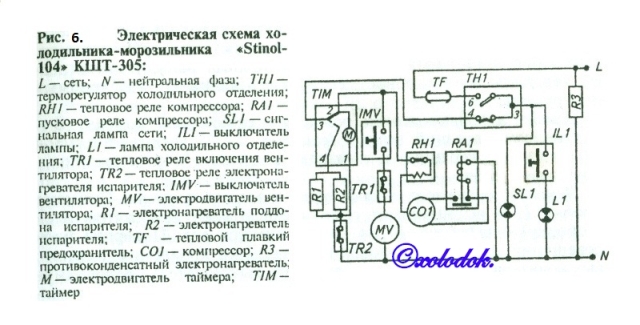 Электрическая схема (рис.6) обеспечивает работу холодильника в полностью автоматическом режиме. При замыкании цепи терморегулятора ТН1 напряжение подается на контакты 2 — 3 таймера TIM, через них — в электроцепь компрессора СО1, электродвигателя вентилятора MV, электродвигателя таймера М. Компрессор обеспечивает циркуляцию хладагента в системе холодильного агрегата и снижение температуры испарителей МК и ХК.При снижении температуры испарителя МК до —10 °С реле TR1 (замедлитель вращения крыльчатки вентилятора) 10 (см. рис.2.), закрепленное на испарителе, включает электродвигатель вентилятора, который обдувает ребристый испаритель и подает воздух в МК, тепловое реле TR2 также замыкается,обеспечивая включение электродвигателя М таймера, который начинает отсчет времени работы компрессора.Таймер Т1М через определенный отрезок времени работы компрессора (8...10 ч) отключает электродвигатели компрессора, вентилятора, таймера и включает электронагревательные сопротивления R2 (оттаивания испарителя) и R1 (нагревателя поддона испарителя). Если контакты терморегулятора ТН1 замкнуты, идет процесс оттаивания слоя инея с испарителя МК. При достижении испарителем температуры 10 °С реле TR2 отключает электронагревательные сопротивления Rl, R2 и обеспечивает по электрической цепи ТН1, TIM, R2, М, RH1, СО1, RA1 работу электродвигателя таймера. Контакты таймера переключаются, при этом отключаются нагревательные сопротивления R1 и R2 и включаются цепи электродвигателей компрессора, вентилятора и таймера. Контакты реле TR1 и TR2 при этом разомкнуты. Начинается охлаждение испарителя МК, через некоторое время срабатывает реле TR1, включается электродвигатель вентилятора. При открывании двери МК выключатель I МVотключает вентилятор.