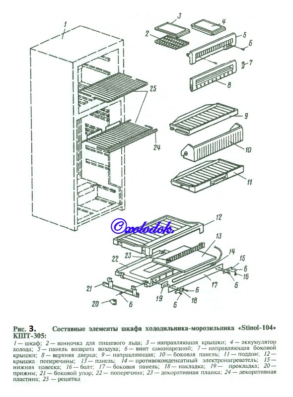 Устройство холодильника-морозильника. Холодильник-морозильник «Stinol-104» КШТ-305 (NF3304T) трехкамерный и состоит из холодильной, морозильной и выдвижной (для хранения овощей и фруктов) камер.