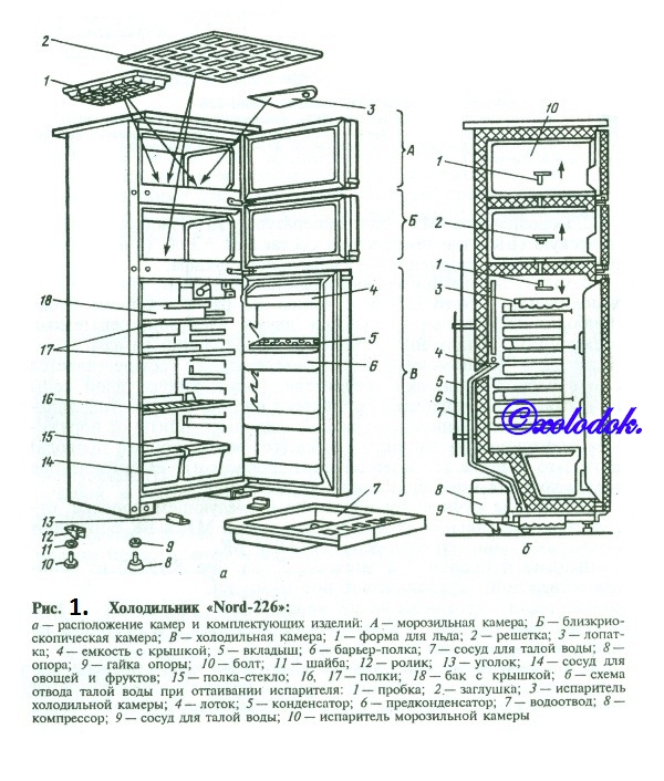 В холодильнике применен холодильный агрегат, аналогичный холодильнику «Nord-225» и с таким же расположением блока приборов. Холодильник снабжен двумя электронагревателями поперечины. Оттаивание испарителя холодильной камеры автоматическое (с помощью электронагревателя); осуществляется оно в период остановки испарителя. Схема отвода талой воды при оттаивании испарителя приведена на рис.1, б.