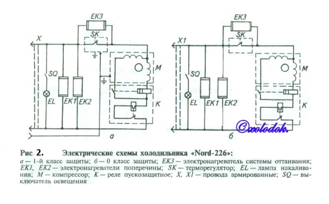 Холодильник может быть выполнен с разной степенью защиты от поражения электрическим током: 0 класса (без заземляющего провода) или 1-го класса (с заземляющим проводом). Электрические схемы холодильника приведены на рис.2.