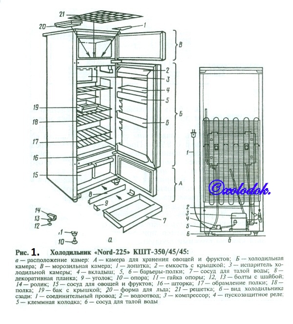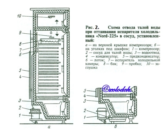 Снеговой покров с испарителя 7 (рис.2.) оттаивается автоматически в период остановки компрессора. Во время оттаивания испаритель покрывается каплями воды, которая по водоотводу 3 стекает в сосуд для талой воды 2, установленный на компрессоре 7 (рис.2, а) или под шкафом (рис. 2, б), и испаряется при температуре окружающей среды. В случае повышенных нагрузок, например при значительной загрузке морозильной камеры свежими продуктами и при высокой температуре окружающего воздуха, холодильный агрегат может работать непрерывно. При этом автоматическое оттаивание испарителя холодильной камеры не осуществляется.Оттаивание возобновляется при переходе холодильного агрегата на цикличный режим работы (при полном замерзании продуктов). В этом случае после первых циклов оттаивания на поверхности испарителя холодильной камеры могут оставаться небольшие капли инея или льда. Это не должно являться причиной беспокойства потребителя по поводу исправности холодильника.Трехкамерный холодильник «Nord-235» имеет устройство, аналогичное устройству холодильника «Nord-225», но объем морозильной камеры в нем достигает 65 дм .