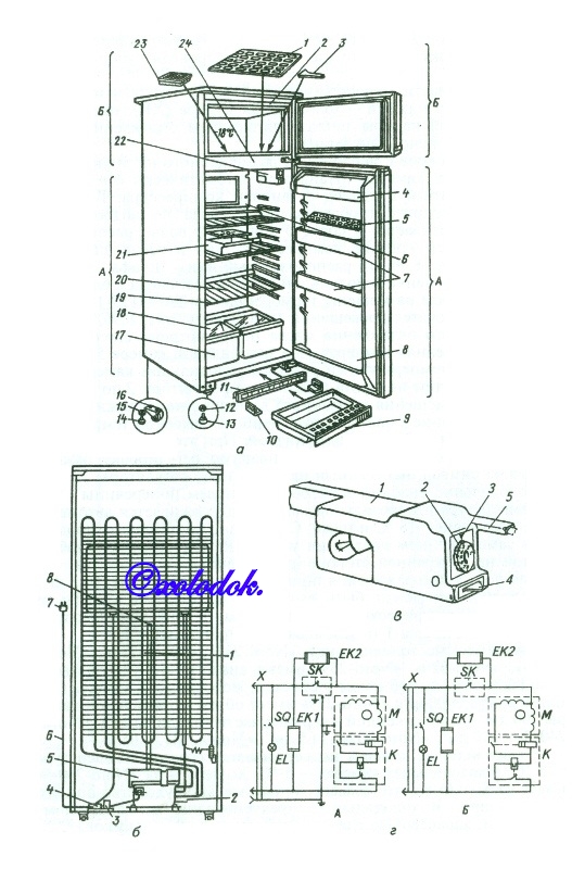 Холодильник двухкамерный, предназначен для замораживания и хранения пищевых продуктов, а также для приготовления для пищевого льда (рис. 1, а, 6, в).