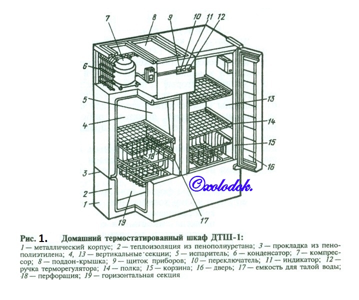 Домашний термостатированный шкаф ДТШ-1(рис. 1.) предназначен для длительного хранения овощей и фруктов в свежем и консервированном состоянии при средней температуре от 3 до 7 °С и температуре окружающего воздуха от 16 до 32 "С.