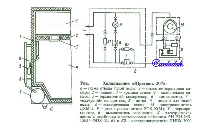 Холодильник «Юрюзань-207» КШД-220/40 двухкамерный, выполнен в виде металлического напольного шкафа с холодильной и низкотемпературной камерами, закрываемыми отдельными дверями. Внутренняя камера стальная эмалированная. Герметизация дверных проемов холодильника осуществляется эластичным двухбаллонным уплотнителем с магнитной вставкой.