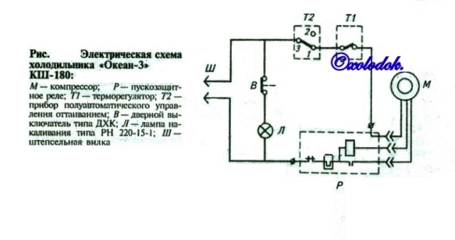 Холодильник «Океан-3» KПШ-180 однокамерный, предназначен для хранения в охлажденном и замороженном состоянии пищевых продуктов, охлаждения напитков и приготовления пищевого льда.Холодильник «Океан-3» выполнен в виде напольного шкафа и имеет металлическую внутреннюю камеру. В верхней части холодильной камеры помещается испаритель, образующий низкотемпературное отделение холодильника. Он закрывается дверцей, обеспечивающей стабильность температуры в низкотемпературном отделении, служит для замораживания и хранения пищевых продуктов и приготовления пищевого льда. Под низкотемпературным отделением находится поддон для стекания талой воды, которая удаляется за пределы холодильной камеры по трубопроводу в поддон для сбора талой воды, установленный под холодильником.Охлаждение продуктов в холодильнике осуществляется герметичным холодильным агрегатом.Система холодильного агрегата заполнена хладагентом R12 и минеральным маслом ХФ 12-16.Для удобства пользования в холодильнике имеются съемные полки, регулируемые по высоте, полки и ячейки на панели двери, форма для льда, сосуды для овощей и фруктов, освещение и ограничитель открывания двери.В холодильном агрегате применен компрессор XKB5-1ЛБN, допускается изготовление холодильников с компрессором ХКВ6- 1ЛБN и пускозащитным релеРЗ-1-1.Терморегулятором служит прибор Т-110-1. Холодильник снабжен прибором полуавтоматического управления оттаиванием ТО-11.
