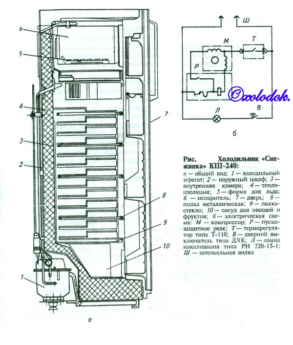 Холодильник «Снежинка» КШ-240 (рис. а) однокамерный с автоматическим поддержанием заданной температуры, выполнен в виде напольного металлического шкафа прямоугольной формы с внутренней пластмассовой камерой, имеющей полки с регулируемой установкой по высоте. Корпус холодильника покрыт белой эмалью. Для герметизации внутренней камеры холодильника на двери имеется уплотнитель с магнитной вставкой,который одновременно является запирающим устройством. В верхней части внутренней камеры расположено низкотемпературное отделение, закрываемое специальной дверцей. Для теплоизоляции холодильника применяются плиты из стекловолокна.Холодильный агрегат работает на R12. Масло ХФ 12-16 или ХФ 12-18. Оттаивание слоя инея с испарителя осуществляется естественным путем. Компрессор приводится в действие от однофазного асинхронного электродвигателя с короткозамкнутым ротором типа ЭДП. Электрическая схема холодильника «Снежинка» представлена на рис. б.
