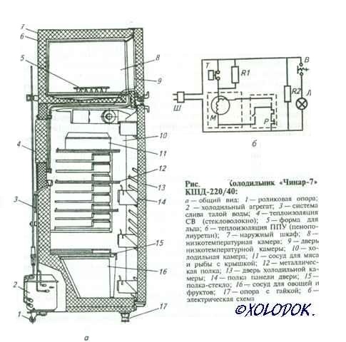 Этот холодильник однокамерный, представляет собой напольный металлический шкаф 5 , внутри которого помещена пластмассовая холодильная камера. Между стенками холодильной камеры и шкафа находится теплоизоляция 11 — стекловолокно. Шкаф покрыт эмалью. Камера освещается лампой, закрытой плафоном 6, которая автоматически включается при открывании двери 24 за ручку 15. Дверь в закрытом положении плотно прилегает к шкафу благодаря магнитной вставке, которая находится в баллоне эластичного поливинилхлоридного уплотнителя 27. В верхней части холодильной камеры расположен испаритель 13, закрывающийся дверцей 16. В испарителе устанавливают форму 17 для получения льда, основание 18 формы и поддон 19. Холодильная камера снабжена съемными металлическими полками 23. В нижней части холодильника установлены пластмассовые сосуды 26, закрывающиеся стеклянной полкой 25, предназначенные для хранения овощей и фруктов. Бак 22 служит для хранения мяса и рыбы.Для поддержания требуемого теплового режима в холодильной камере установлен терморегулятор 20, осуществляющий автоматическое регулирование температуры внутри камеры. Охлаждение камеры обеспечивается компрессионным холодильным агрегатом 4. Компрессор кулисного типа с внутренней подвеской. Кожух его жестко прикреплен к раме. Конденсатор установлен на задней стенке шкафа. Для предохранения трубок конденсатора от повреждения предназначен упор 8. Испаритель вводится в шкаф через проем в задней стенке и закрывается двумя фланцами — внутренним 12 и наружным 10.Холодильник оснащен системой полуавтоматического естественного оттаивания испарителя с отводом талой воды по трубке 7 в бак 30, расположенный под холодильником. Кнопка 21 оттаивателя расположена рядом с терморегулятором.Конструкция холодильника предусматривает возможность перенавески двери для лево и правостороннего открывания. Навеска двери регулируется с помощью регулировочных шайб, устанавливаемых под нижнюю и верхнюю 14 петли двери, а также прокладки 28.Для легкого передвижения холодильника по полу имеются роликовые опоры 1, а для установки холодильника стационарно — опора 29.Электрическая схема холодильника «Чинар» включает электродвигатель типа ЭДП-24 компрессора М; пуско-защитное реле Р типа РЗ или РПЗП-24, предназначенное для пуска электродвигателя и защиты его от токовых перегрузок; терморегулятор Т2 типа Т-110-1, автоматически поддерживающий в камере заданную температуру; прибор полуавтоматического управления оттаиванием Т2 типа ТО-11; дверной выключатель В типа ВОК-2 и лампу накаливания Л типа РН 220-15-1, предназначенные для освещения камеры; соединительный шнур со штепсельной вилкой Ш.