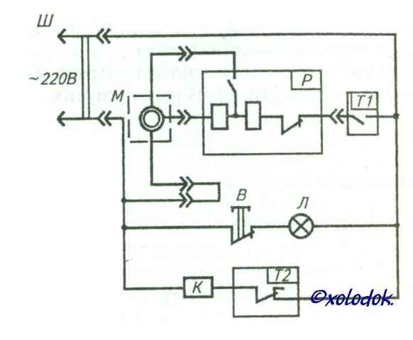 Корпус холодильника покрыт бесцветным лаком, а верхняя рабочая плоскость, выполненная в виде стола, — полиэфирным лаком. Дверь имеет уплотнитель с магнитной вставкой, который одновременно служит и запирающим устройством. В верхней части холодильника находится низкотемпературное отделение (НТО), в котором поддерживается температура воздуха не выше -12 °С при температуре окружающей среды 32 "С. Холодильный агрегат компрессионного типа работает на R12. Теплоизоляцией служит стекловолокно. Температура воздуха в холодильной каме¬ре поддерживается автоматически с помощью терморегулятора Т-110-1.Электрическая схема холодильника состоит из электродвигателя компрессора М; пускозащитное реле Р, пред-назначенного для пуска электродвигателя и защиты его от токовых перегрузок; терморегулятора Г типа Т-110-1, лампы накаливания Л типа РН 220-15 и дверного выключателя В типа ВОК-2, предназначенных для освещения камеры.