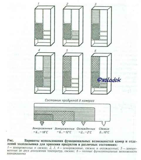 Температурный режим универсальной камеры. Температурный режим задается терморегулятором 11. При необходимости хранения в универсальной камере продуктов в замороженном виде при температуре от -6 до -12 °С терморегулятор ставят в положение «*» — принудительно открытая заслонка регулятора. При таком режиме будет обеспечиваться хранение замороженных продуктов до 1,5 мес.При отсутствии продуктов в универсальной камере или же для краткосрочного их хранения регулятор необходимо поставить в положение «О». Подача охлаждающего воздуха в камеру прекращается. Более низкая температура в камере по сравнению с температурой окружающего воздуха будет поддерживаться в результате охлаждения через стенки морозильной и холодильной камер.Режим хранения продуктов в охлажденном виде при температуре от —2 до +2 °С можно получить при установке терморегулятора в положение «4» или «5», а режим хранения продуктов в свежем виде — в положение «1», «2» или «3».Температурный режим холодильной камеры. Температурный режим задается терморегулятором 12. Установка ручки терморегулятора в положение «1», «2» или «3» будет обеспечивать хранение продуктов при температуре от 0 до 10 °С, а установка в положение «4» или «5» — от —2 до +2 °С.При отсутствии продуктов для хранения холодильную камеру можно отключить от системы охлаждения, для чего регулятор температуры необходимо установить в положение «0». Подача холодного воздуха через регулятор прекратится, и температура в камере будет максимальной, так как она будет охлаждаться толь¬ко через ограждающие ее стенки морозильной и универсальной камер. При установке температурных режимов в камерах руководствуются условиями предполагаемых сроков хранения продуктов. При этом следует иметь в виду, что при более низких температурах, чем это необходимо, холодильник будет неоправданно много потреблять электрической энергии.